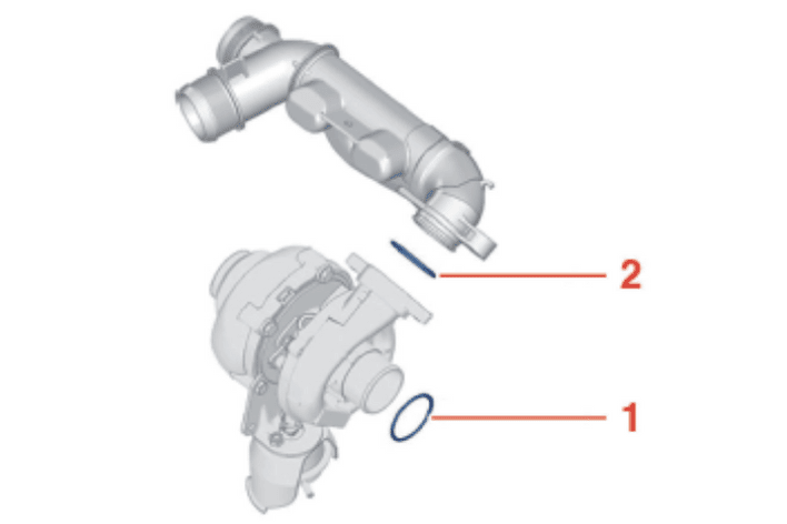 Nettoyez les éléments inspectés si le besoin s’en fait sentir. Remplacez ensuite les joints du turbo : le joint orange (1) à l’entrée sur le raccord du turbo, et le joint torique (2) sur le connecteur d’admission d’air.
